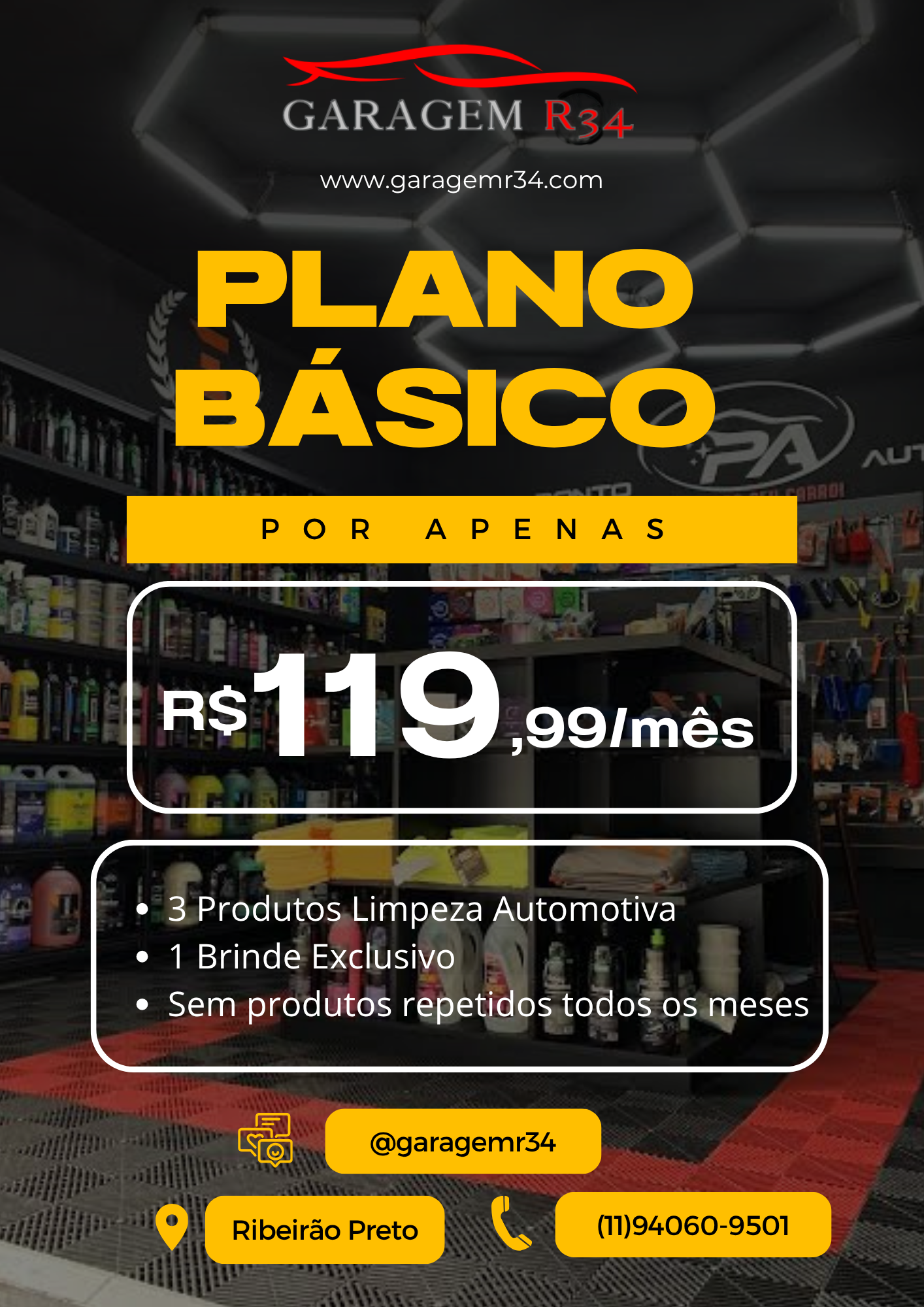 O Plano Básico da Garagem R34 foi desenvolvido para quem busca manter o alto padrão na estética automotiva sem complicação e com excelente custo-benefício.